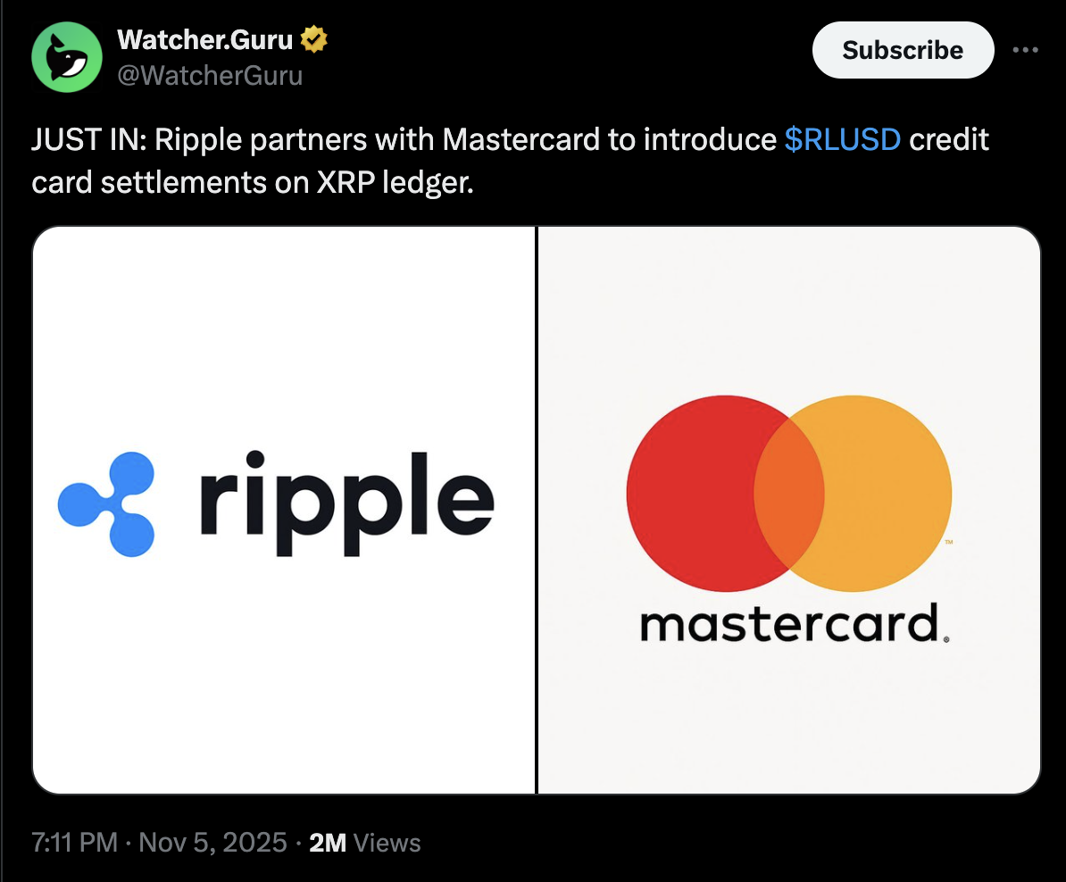 El rally fue impulsado por Ripple nueva asociación con Mastercard. Juntos, lanzaron un piloto utilizando RLUSD para liquidar pagos con tarjeta fiduciaria a través del XRP Ledger. Dado que RLUSD ya supera los mil millones de dólares en circulación, esto indica un gran paso adelante para XRP en la liquidación en tiempo real.