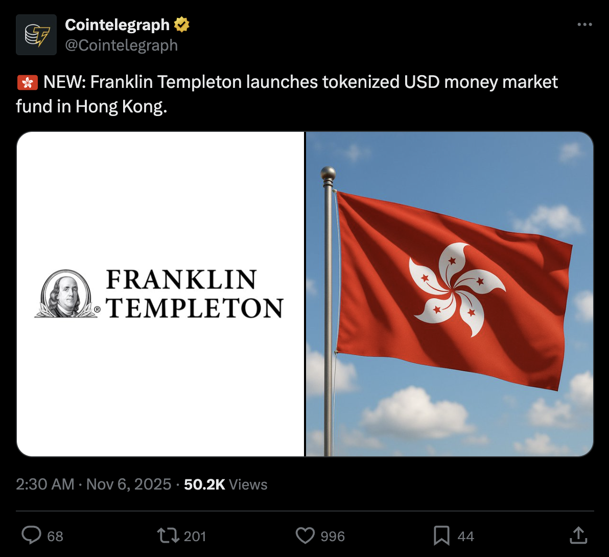 Franklin Templeton acaba de lanzar su fondo de mercado monetario tokenizado en dólares estadounidenses en Hong Kong. La estructura totalmente en cadena es parte de un impulso creciente por parte de los gigantes de TradFi para aprovechar la tokenización RWA.