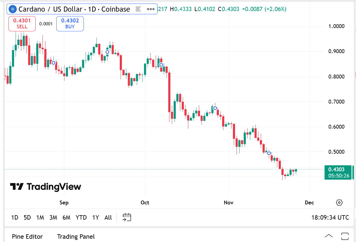 Cardano se vende a 0,4301 dólares, un aumento significativo de la ganancia del 2,52% en las últimas 24 horas, con una capitalización de mercado de 15.420 millones de dólares, con un volumen de operaciones diario de 587,29 millones de dólares, lo que supone una caída del 13,22%.