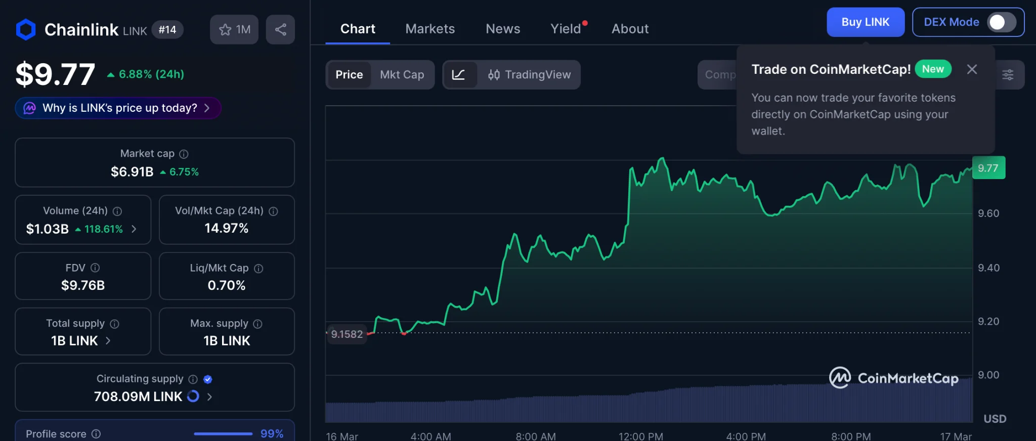 Chainlink cotiza cerca de $ 9,77 con un RSI neutral de 41,97 según CoinMarketCap. Se prevé que LINK alcance los 21,56 dólares a finales de 2026, un rendimiento de aproximadamente el 140%.