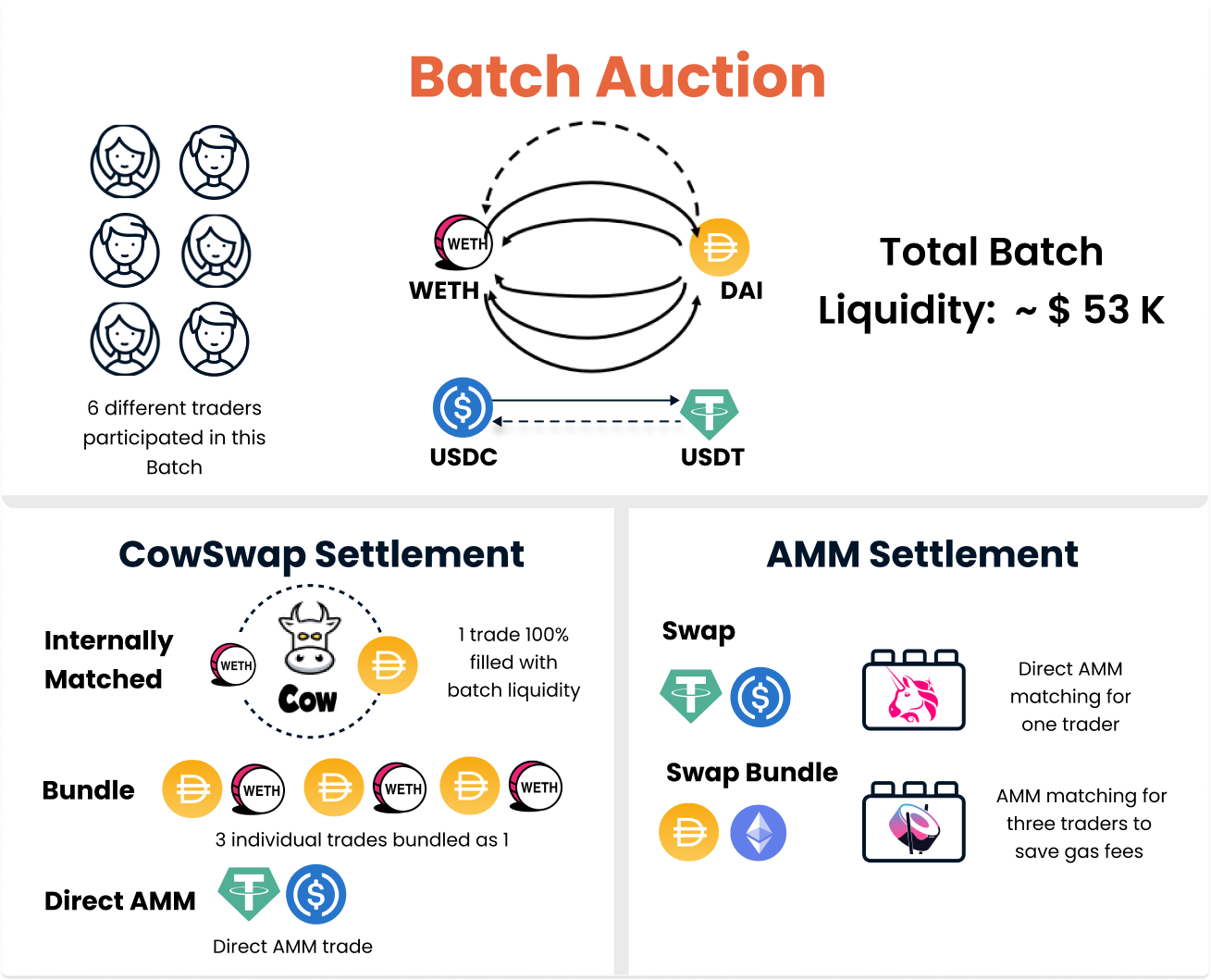 Todos los pedidos coincidentes dentro de un lote pueden liquidarse fuera de la cadena a través de la liquidez que se encuentra en la coincidencia de deseos (CoW) entre pedidos, o en la cadena contra la liquidez de AMM/agregador.