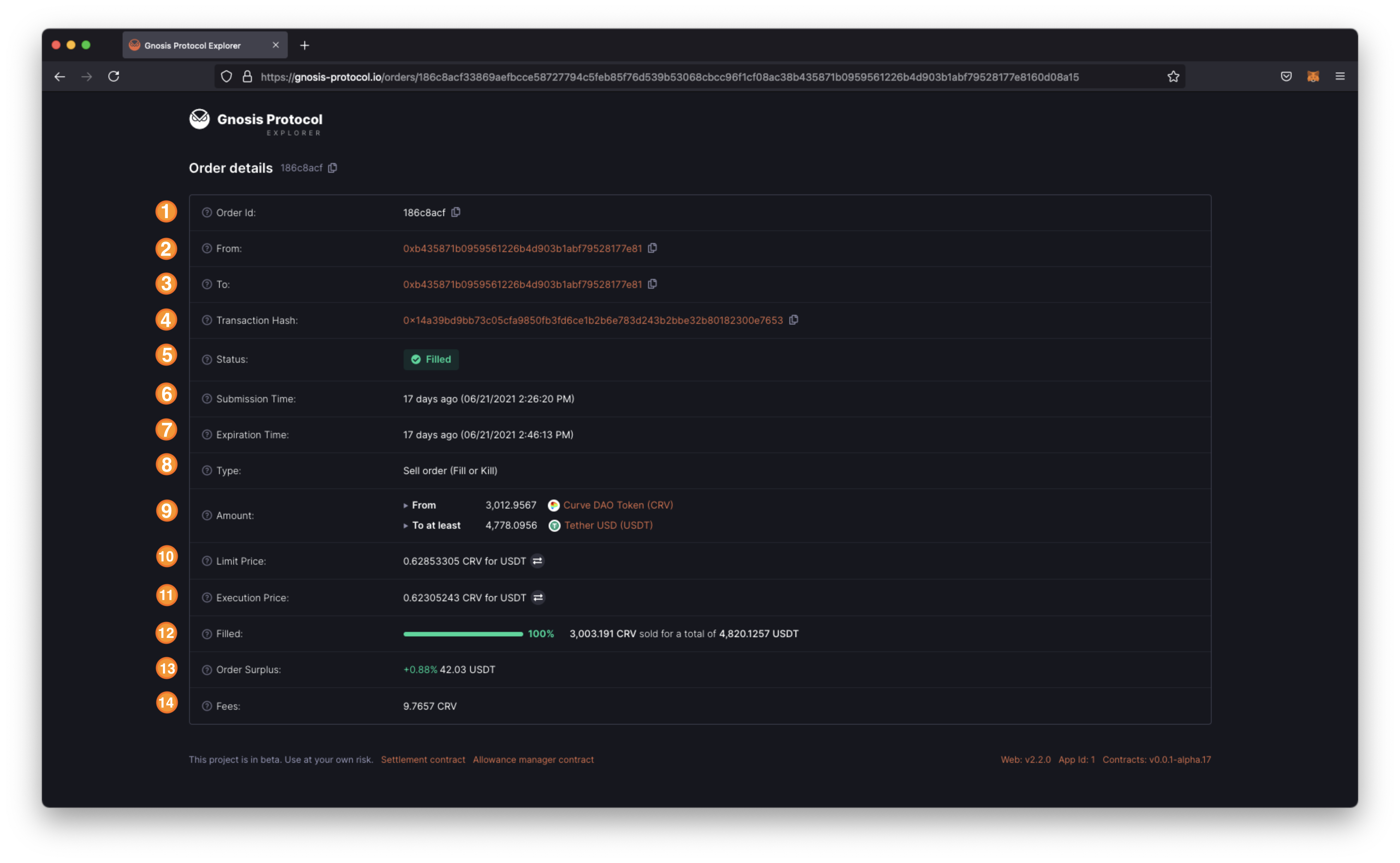 - Excedente de pedido: En caso de que el protocolo encuentre un precio mejor que el precio límite del usuario, el excedente de pedido cuantifica en porcentaje y tokens cuánto más obtuvo el usuario por encima de la cantidad solicitada.