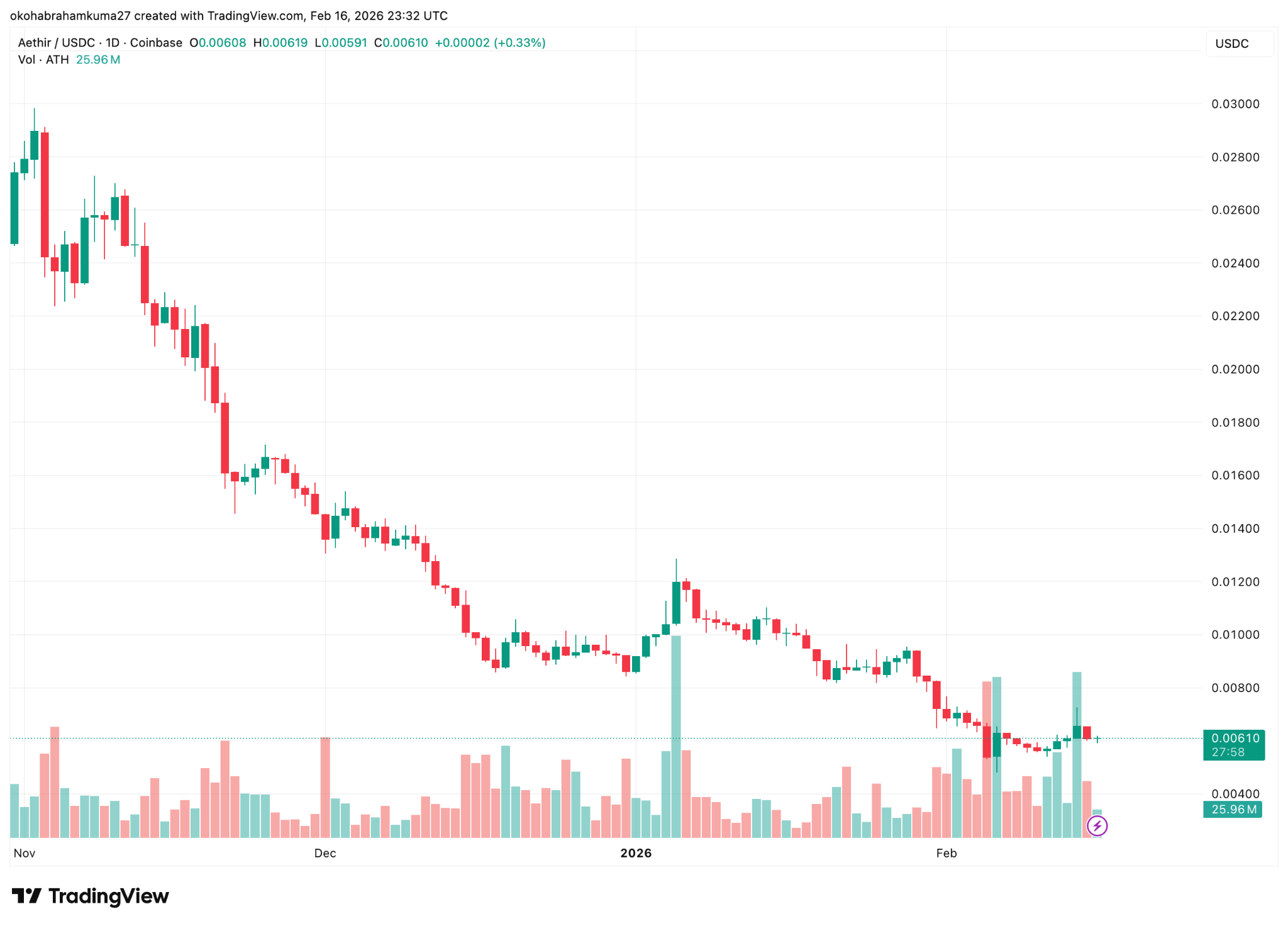 Aethir ($ATH), una plataforma de infraestructura de nube descentralizada, actualmente está luchando por mantener su equilibrio. El token se cotiza en condiciones de miedo extremo, con una alta volatilidad de casi el 19% al 16 de febrero.