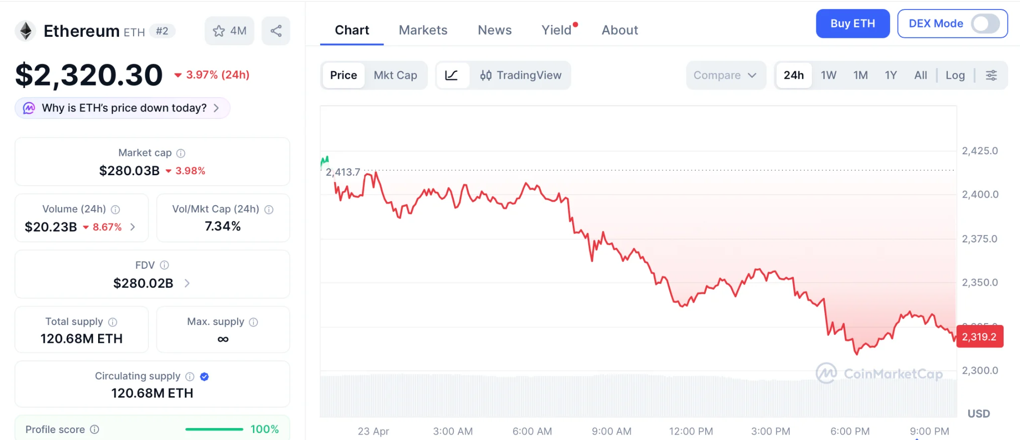Ethereum (ETH) cotiza a 2.320 dólares el 23 de abril por CoinMarketCapretrocediendo un 3,97% después de superar los 2.400 dólares durante el repunte del alto el fuego.