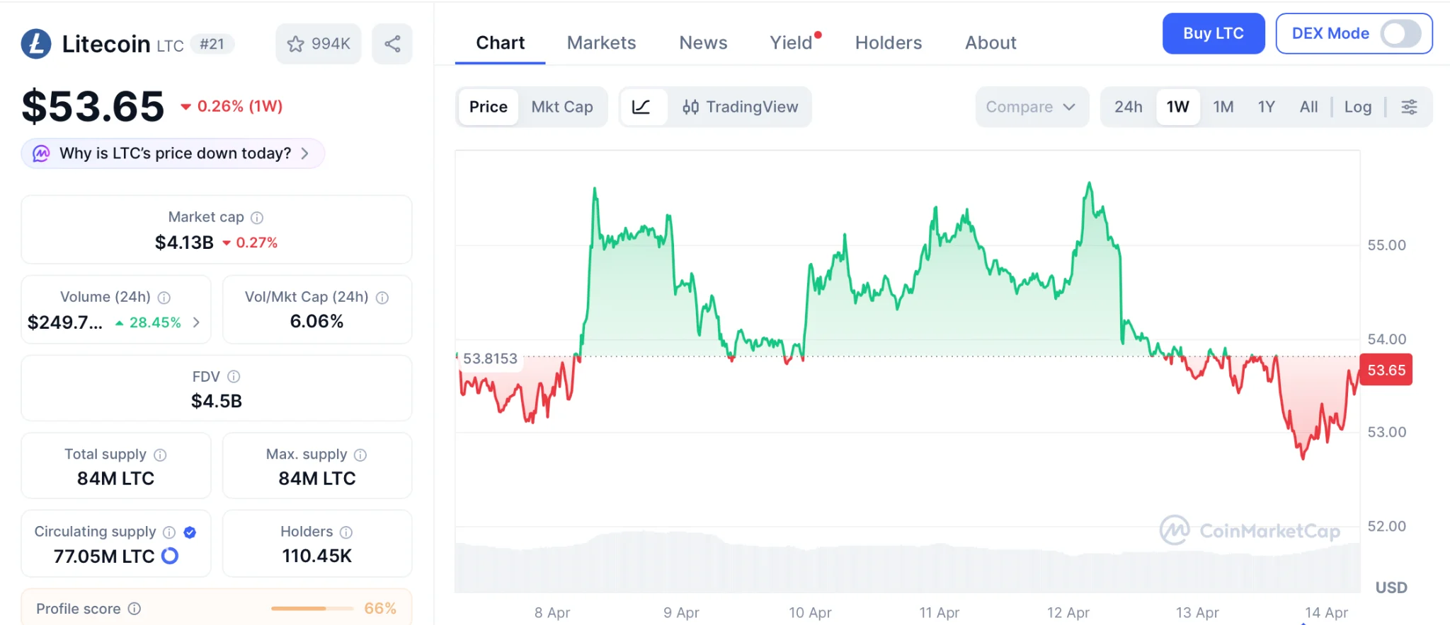 Litecoin (LTC) tiene $53,65 por CoinMarketCapun 87% menos que su máximo histórico de 410 dólares a pesar de obtener la clasificación oficial de producto básico. El volumen de operaciones cayó un 33% durante el último mes.