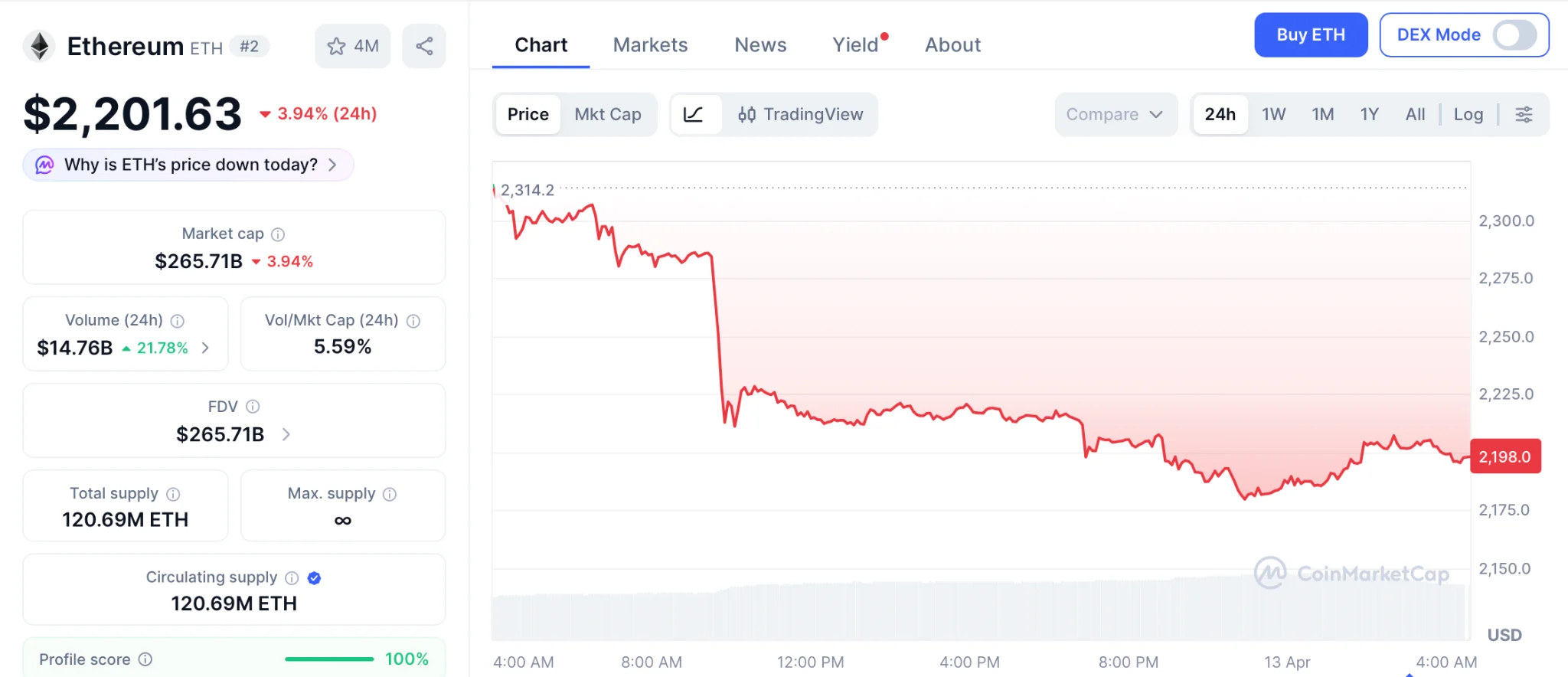 Ethereum (ETH) cotiza a 2.201 dólares por CoinMarketCapcon un volumen neto de compradores de 104 millones de dólares y la Fundación apostando 45.000 ETH para reducir la presión de venta. El objetivo de predicción del precio de Ethereum a corto plazo es de $ 2,500 si se mantienen $ 2,100, y el próximo Citi es de $ 3,175.