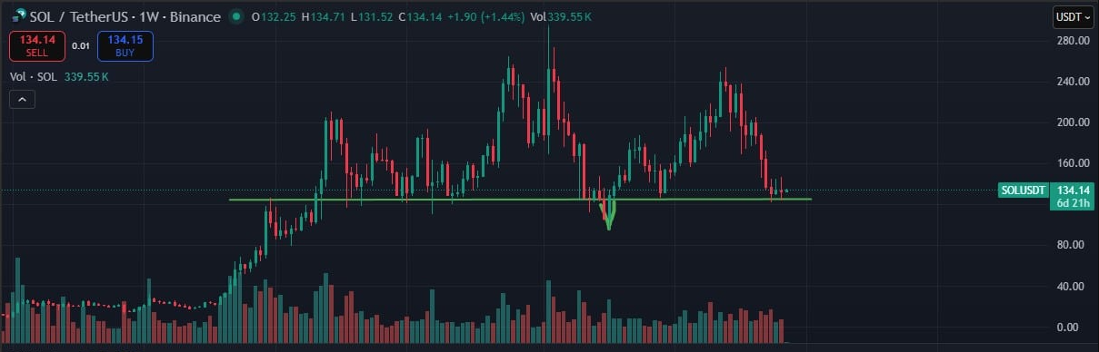 Si observamos el gráfico semanal, SOL muestra uno de sus mejores momentos de los últimos meses. Se defendió la región de $130, un movimiento importante porque es un precio que actúa como soporte y se ha mantenido durante casi 18 meses. Esta sería una de las mejores relaciones riesgo-recompensa para quienes quieran invertir en SOL.
