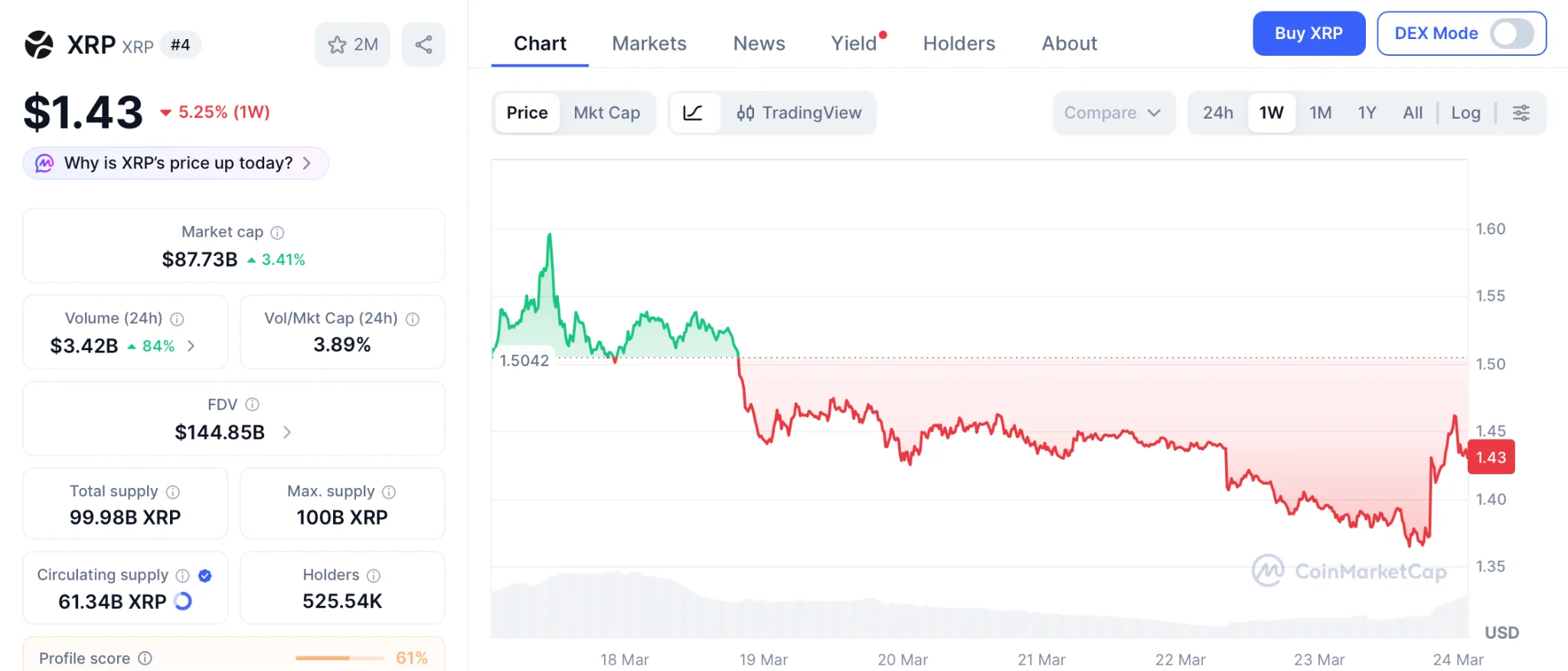 XRP cotiza cerca de $ 1,43 al 23 de marzo con la clasificación de productos básicos de la SEC y $ 1,44 mil millones en entradas de ETF al contado, según CoinMarketCap.