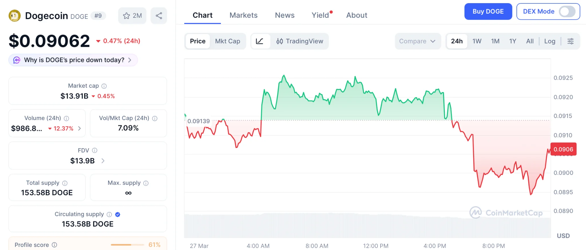 DOGE cotiza a 0,090 dólares el 27 de marzo, muy por debajo de los máximos que lo hicieron famoso, según CoinMarketCap.