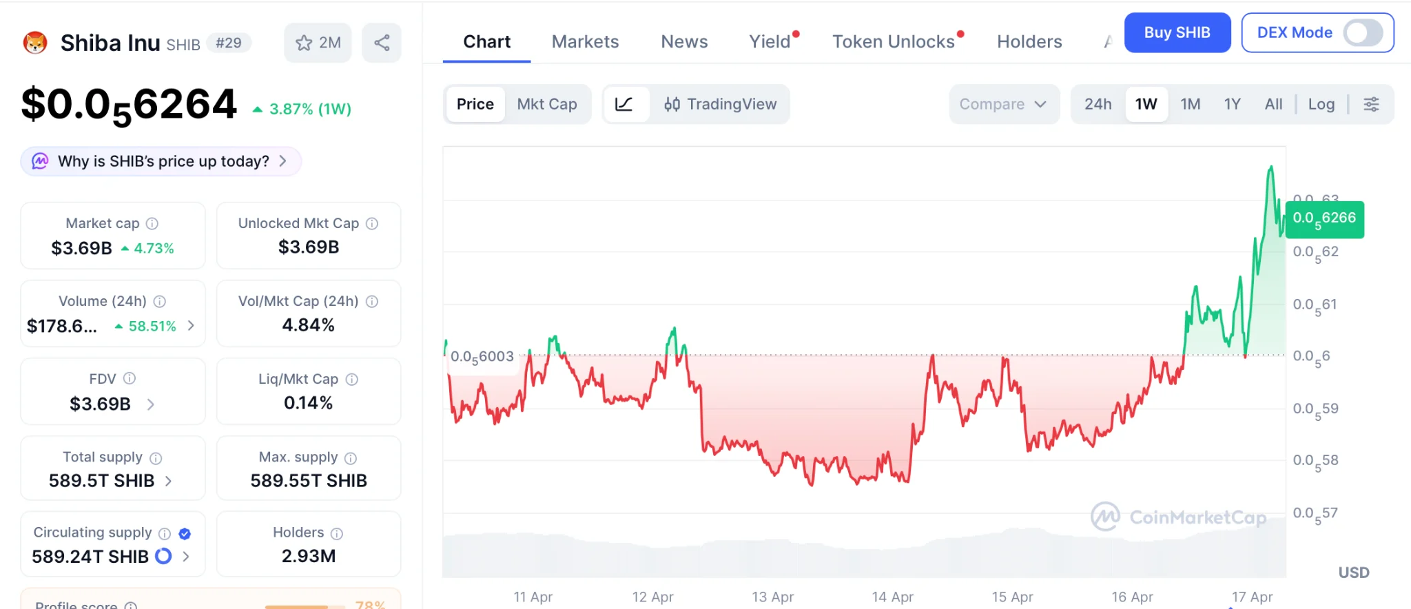 Shiba Inu (SHIB) cotiza cerca de $0,0000062 el 17 de abril, un 93% menos que su máximo histórico de $0,00008616, según CoinMarketCap. Un salto en la tasa de quema del 10,500% eliminó 173 millones de tokens en una noche, pero SHIB no se movió porque ese número es un error de redondeo frente a un suministro total de 589 billones.
